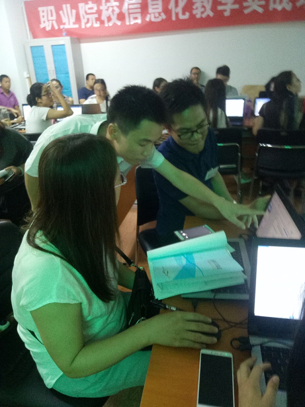本次培训班采取了结对分组、理论学习、实战训练、作品分享几种形式,按照项目为引领、任务为驱动,通过案例教学,使老师们全面掌握了信息化教学设计、信息化课堂教学、资源建设工具等内容。